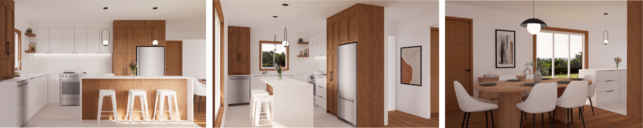 Ce projet vise à moderniser la cuisine tout en préservant le caractère de la maison grâce aux boiseries existantes. L’ajout d’un îlot central permet d’optimiser l’espace, de faciliter la préparation des repas et d’offrir davantage de places pour recevoir. La disposition linéaire améliore la fonctionnalité, tandis que les armoires shaker en mélamine effet bois rappellent le style d’origine. Les caissons pâles apportent luminosité et modernité, et le comptoir ainsi que le dosseret en quartz ajoutent une touche d’élégance. La hotte encastrée et le coin déjeuner intégré contribuent à un ensemble épuré et convivial.